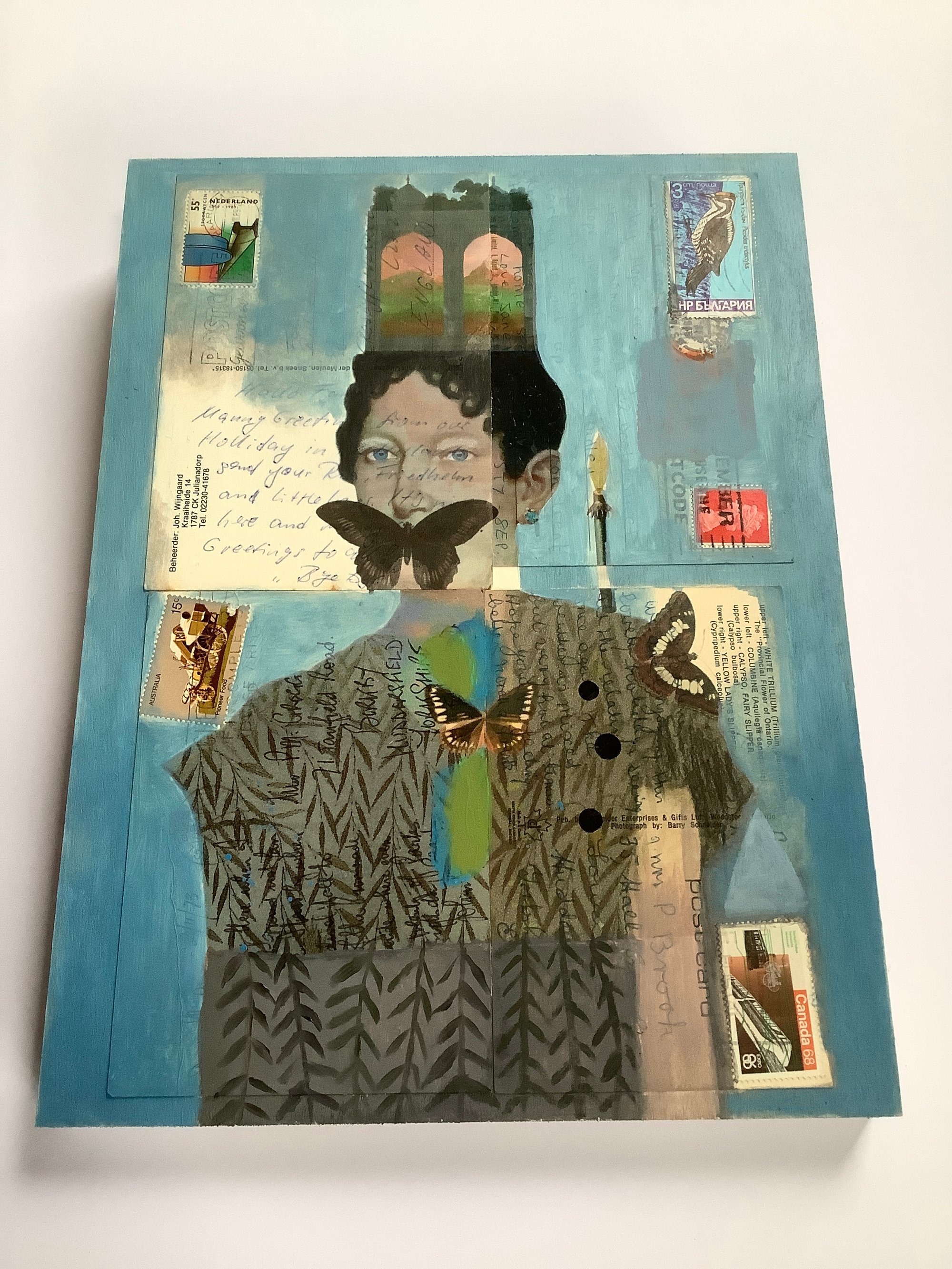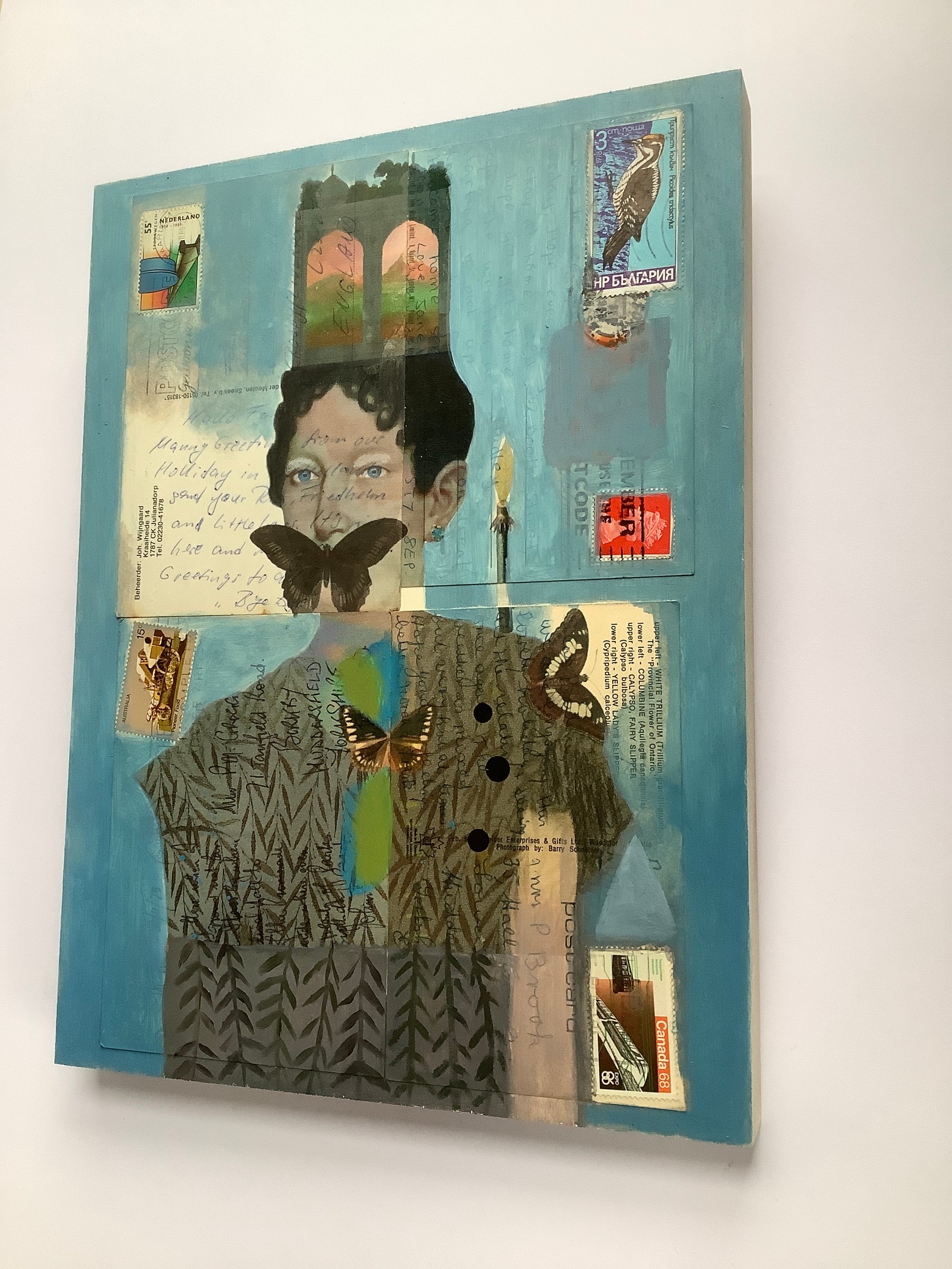 Collage and oil paint on original vintage postcards,stamps and letters from 1930s onwards showing the original messages, marks and traces of age.